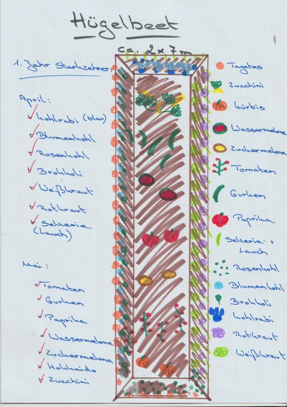 Deine Zeichnung finde ich wieder herzallerliebst, auch wenn so viel Gemüse auf dem Hügelbeet definitiv keinen Platz finden wird. Wenn ich die Betonplatten abzähle, sind das ja nur ca. 3 oder maximal 4 Meter, da passt genau ein Kürbis und ein Zucchini drauf, und dann ist das Beet voll. Halt nicht jetzt, aber spätestens im Sommer. ;)