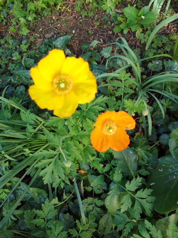 Hier blühen noch immer die Tulpen, die Narzissen und die Lunaria annua, Geranium phaeum fängt dagegen jetzt an. Und da alles viel zu dicht gepflanzt ist, fallen auch die erfrorenen Farne und die gelben Hostas nicht auf.