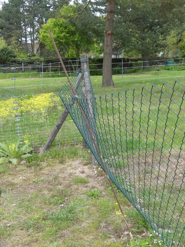 Ja und ja. Wir haben den Zaun am oberen Garten nur provisorisch geschlossen, weil da nochmal eine Lieferung durch soll. Heißt, der Maschendrahtzaun war am Pfosten mit einem Rundeisen an drei dicken Drähten befestigt, in der Mitte, wo sonst ein Pfosten stünde, war nochmal ein Rundeisen gesteckt. Das am Pfosten war ab und verbogen, das in der Mitte ein gutes Stück umgebogen, Zaun somit offen.