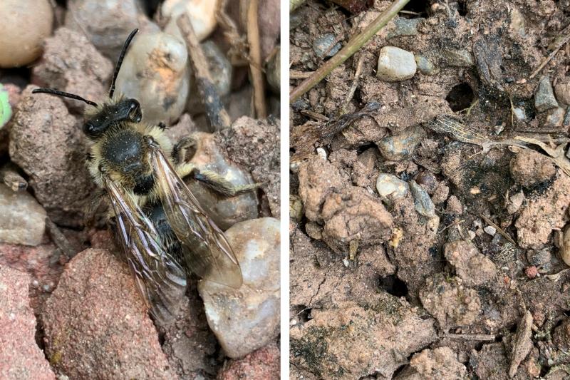 Diese Löcher habe ich eben in einer Aufschüttung aus Sandstein, Kies, Blemenerde und Lehm entdeckt, die ich mal halbherzig im Garten „angelegt“ hatte, um etwas Höhenunterschied in ein Beet zu bekommen. In etwas Abstand saß diese Biene am Boden. Gehören Löcher und Biene zusammen - kann das eine Sandbiene sein?