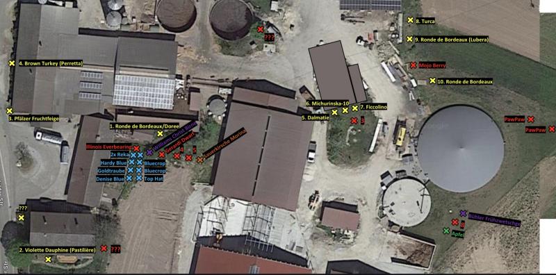 Ich hab mal meinen alten Pflanzplan angehängt, dass ihr mal eine Vorstellung habt. Dort wo zwei Namen stehen, hat sich die Feige als andere Sorte herausgestellt. Kommt echt oft vor 😉 dort wo die Pfälzer Fruchtfeige und die BT steht, dass ist ein genialer Standort. Dort wo die M-10 steht ist meine zweitliebste Stelle. Die haben fast den ganzen Tag Sonne, sind aber nicht zu 100% vom Ostwind geschützt.