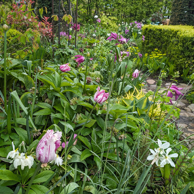 Hier blühen noch immer die Tulpen, die Narzissen und die Lunaria annua, Geranium phaeum fängt dagegen jetzt an. Und da alles viel zu dicht gepflanzt ist, fallen auch die erfrorenen Farne und die gelben Hostas nicht auf.