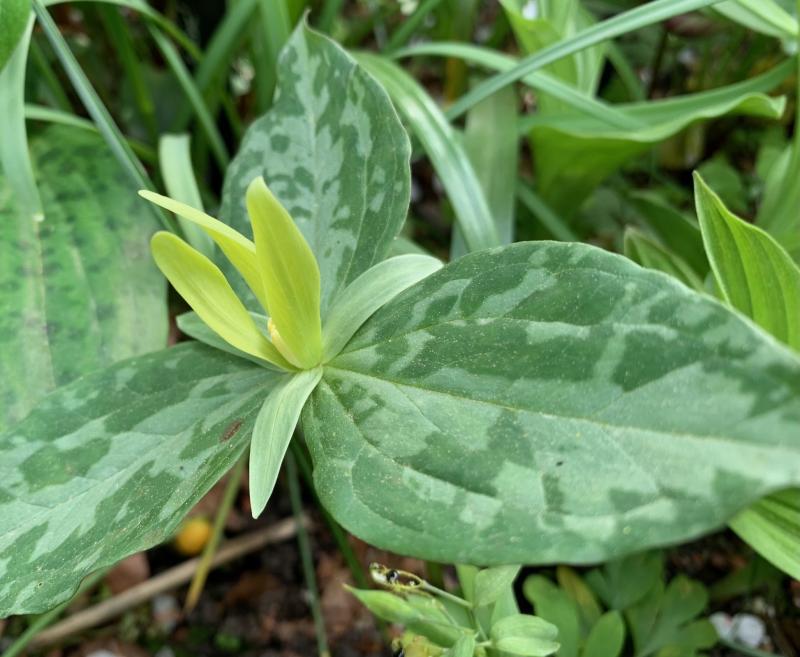 Trillium grandiflorum 'Jenny Rhodes' hat sich immerhin zu einer mageren Blüte durchgerungen.