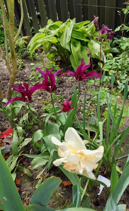 Immer noch Narzissen und die Tulpe China Tower vor Akelei. Im Hintergrund die halb erfrorene grosse Hosta.