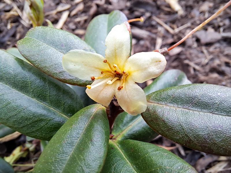 Nachdem mein Rhododendron hanceanum 'Princess Anne' schon verblüht war, ist nun eine einsame neue Blüte erschienen, kleiner und von einem weniger kühlen, vanilligeren Gelbton.