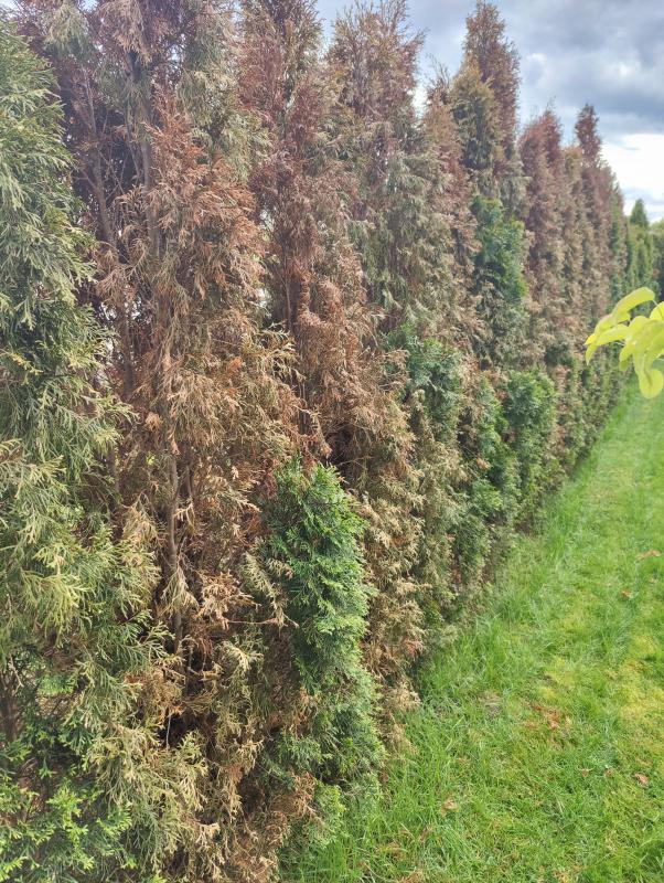 Thuja und Scheinzypresse leiden seit 2018 unter Hitze-Dürresommern, ich hab inzwischen schon viele, teils auch sehr alte Hecken mit braunen Stellen oder sogar ganz abgestorbenen Einzelpflanzen drin gesehen.