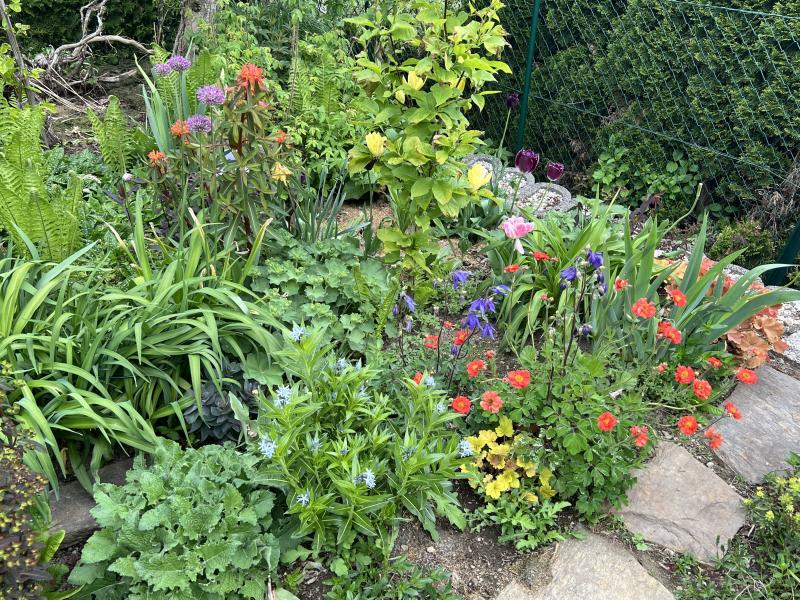 mit Flieder zu eröffnen und mit Veronica gentianoides weiter zu machen ist ja genial für den Mai. ;D Nelkenwurz und Blüten-Hartriegel in rosa passen genau. :D