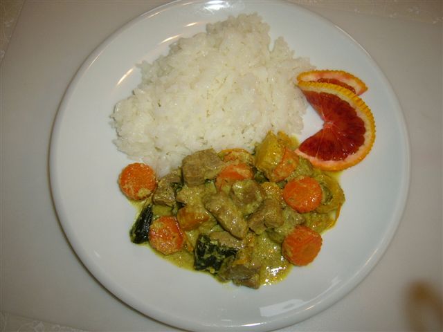 so sah das Orangen-Lamm-Curry auf dem Teller ausdanach gab es frischen Fruchtsalat