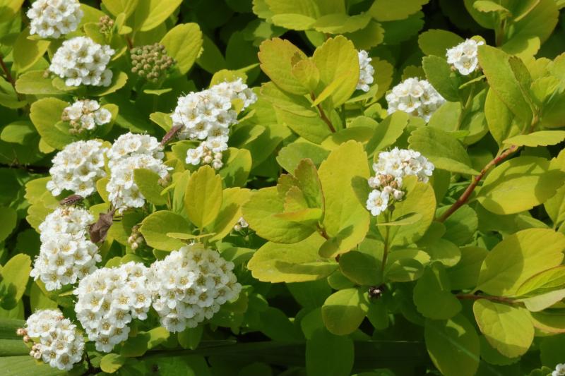 Im Garten blüht Spiraea betulifolia ´Tor Gold´, zum Glück ein Strauch, bei dem die goldfarbenen Blätter zu den Blüten passen.