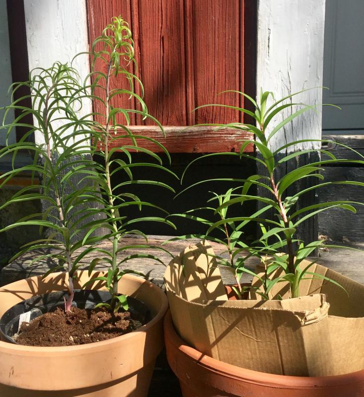 Zweijährige Sämlinge: links Sargentiae, rechts Rosthornii. Beide schießen in die Höhe und dabei sind die Stengel erschreckend schwach oder dürr. (Das Rosthörnchen braucht sogar diesen Stützkragen aus Pappe, um nicht einzunicken.) Was fehlt ihnen? Lichtmangel ist es nicht, und ich habe auch nicht übermäßig gedüngt …?