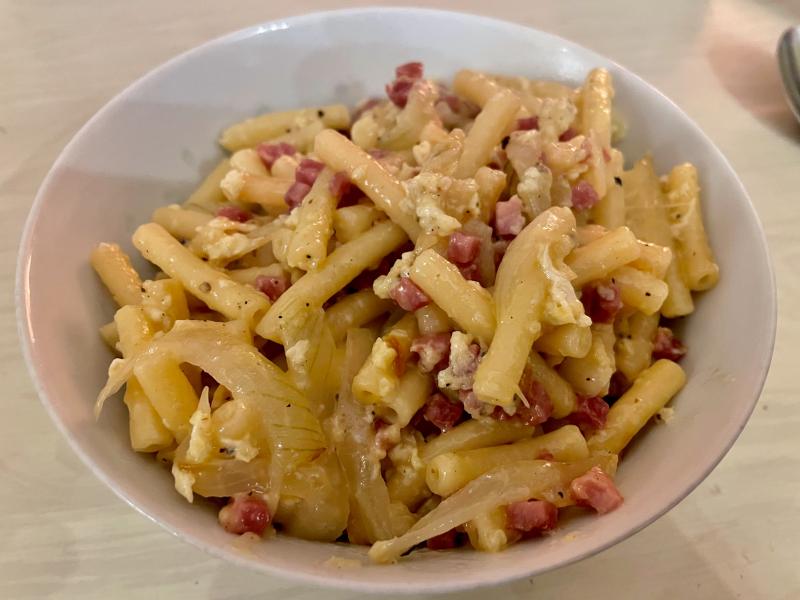 resteverwertung: maccaroni gebraten mit zwiebeln, schinken und ei.