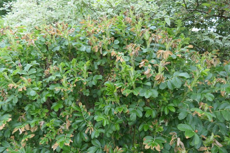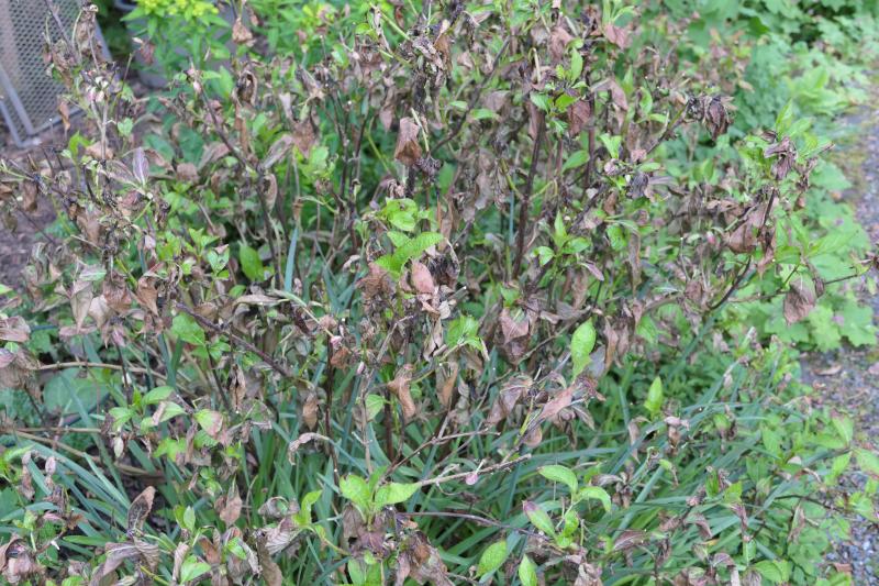 Einige Rosen hatten schon Knospen, die Hortensien auch. Nach dem Frost nicht mehr. An Kirsch- und Pflaumenbaum hängen kleine braune Schrumpelfrüchte. . Es war für hiesige Verhältnisse gar nicht soo kalt, ein paarmal -4°C, aber die Schäden sind umfangreich. Durch die Wärme vorher war einfach alles schon zu weit. :( . Aaaber wenn jemand den Garten besucht, der nicht so fixiert auf jedes Detail ist, wie die Gärtnerin selbst, sieht er die Schäden überhaupt nicht, sondern üppiges grünen und blühen. . Das braune da unten ist eine erfrorene Astilbe, egal. ;D :D