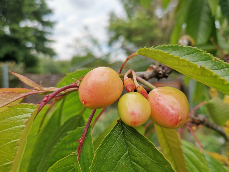 Bei den Kirschen sieht es anders aus. Aufgeplatzt im Regen, und mittlerweile wohl schon von den Amseln gefressen. Das Foto ist 3 Tage alt. Die Früchte gibt es wohl nicht mehr.