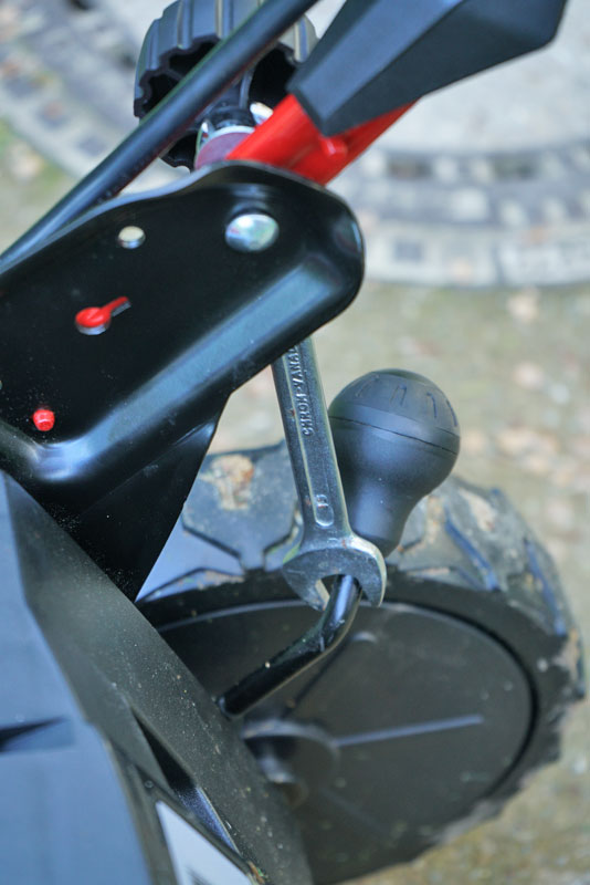 Wie auf dem vorher verlinkten Video zu sehen, kann man bei diesem Mäher das Mähwerk für höchstes Gras höher stellen. Wie man das macht, bleibt einem selber überlassen, ein Hack ist ja nix, was der Hersteller empfehlen würde. Ich habe einen Maulschlüssel statt Holzschiene verwendet. 5 Minuten Aktion, hält gut. Bei so hochgestelltem Mähwerk ziehe ich Schnittschutzstiefel an, auch wenn der Auswurf seitlich montiert ist (Steinschleuder).