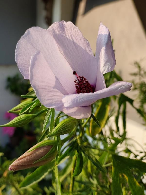 Die erste Blüte von hoffentlich ganz vielen der Alyogyne. Sie ist gar nicht gut durch den Winter gekommen. Hat im Februar im Winterquartier noch geblüht uns sich wohl verausgabt.