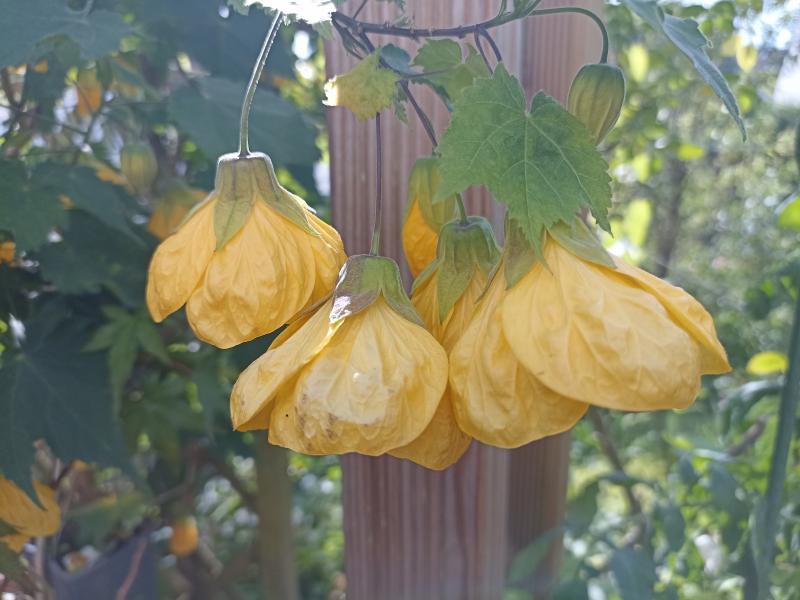 Mittlerweile halte ich Abutilon als "Strauch", das sieht einfach üppiger aus. In einem Topf stecken eigentlich mehrere Pflanzen, so daß es wie ein Strauch wirkt. Vom jährlichen recht starken Rückschnitt eines ursprünglichen Einzelexemplares im Frühjahr mache ich Kopfstecklinge und stecke diese in der Nähe des Topfrandes um die Mutterpflanze tief ins Substrat hinein. Meist gehen davon wieder einzelne an. Das Ganze wirkt viel üppiger und so ist es dann auch nicht so schlimm, wenn mal ein älteres Teil davon ganz den Geist aufgibt. Es wird dann eben bodeneben abgeschnitten. Es steht noch genug drumherum.