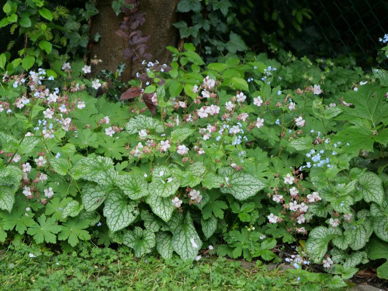 Geranium biokovo schickt sich an, die Brunnera zu überrennen. Zur Zeit aber eine ganz hübsche Kombi.