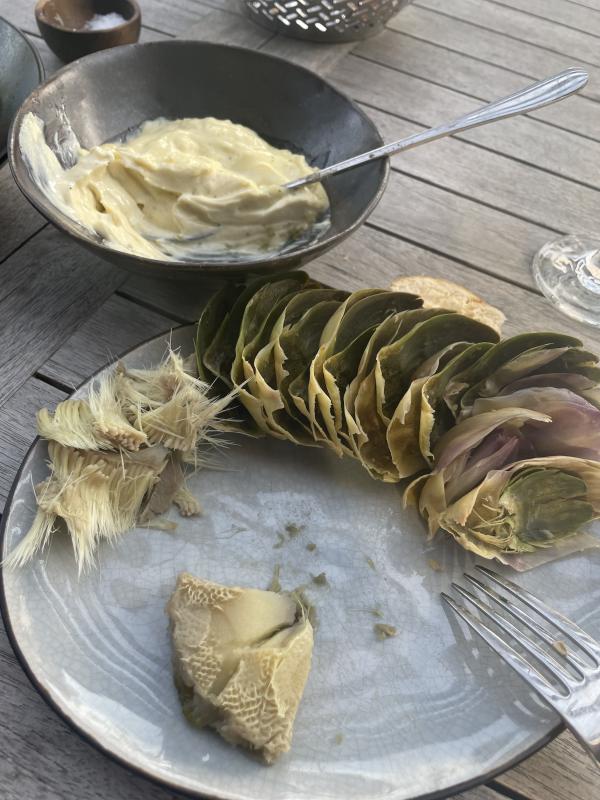 Danach haben wir uns eine Artischocke geteilt. Dazu gab es Aioli, die erst nicht fest werden wollte und dann zu fest wurde ... ;) Wie man sieht, hat es geschmeckt.