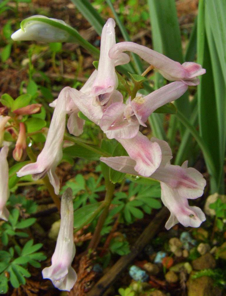 Ja, die Cory-Saison legt jetzt mächtig los - überall rollen sie sich aus dem Boden. Manche Lerchensporne blühen sogar schon länger, wie dieser hier - wahrscheinlich die rosafarbene Form von Corydalis angustifolia.