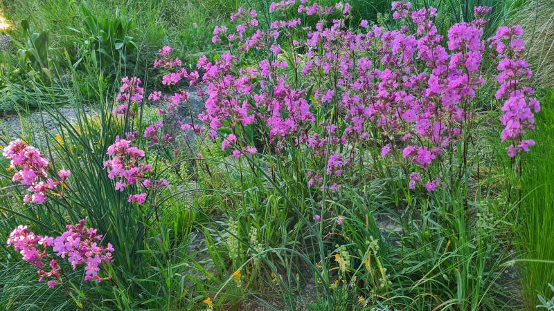 Ich habe hier viele Horste von Silene dioica, Rote Lichtnelke, und mag sie sehr, die Insekten auch. Wegen der vielen Nässe ist sie sehr hoch geworden und wo sie zu dicht zwischen anderen Stauden wächst oder kleinere überwuchert, nehme ich sie raus.