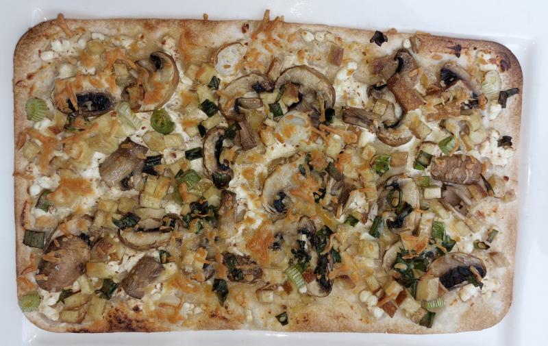 Flammkuchen mit Champignons, Lauchzwiebeln und Räuchertofu