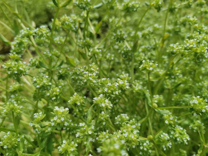 Der Feldsalat geht jetzt hier in die Blüte, zumindest der Teil, der im Kleintunnel mit Lochfolie stand.