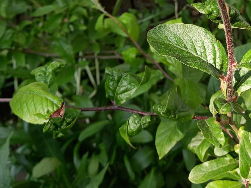 Dieses Jahr zeigt eine Mispel deutliche Blattschäden an Neutrieben. Blätter vom ein- und mehrjährigen Holz sind nicht betroffen. Die anderen Mispelpflanzen haben keine Symptome. Ich vermute Blattläuse. Kennt jemand die Symptome auch?