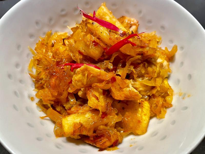 hier hausgemachtes sauerkraut, frische ananas und selbstgekochtes hühnerfleisch aus dem tk als gratin mit verschiedenen chilisaucen 8)