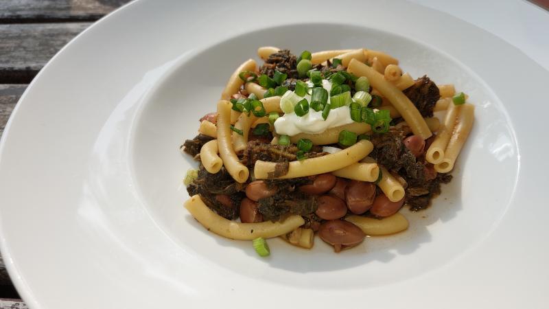 Maccharoni mit Borlotto-Bohnen, Tomaten und Brennnesseln