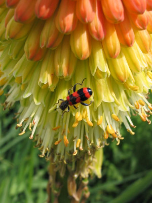 Das sieht nach einem Immenkäfer resp. Bienenwolf (Trichodes apiarius) aus der Familie der Buntkäfer aus.Er ernährt sich von kleinen Insekten. Die Larven leben räuberisch besonders in Bienennestern.LG Silvia