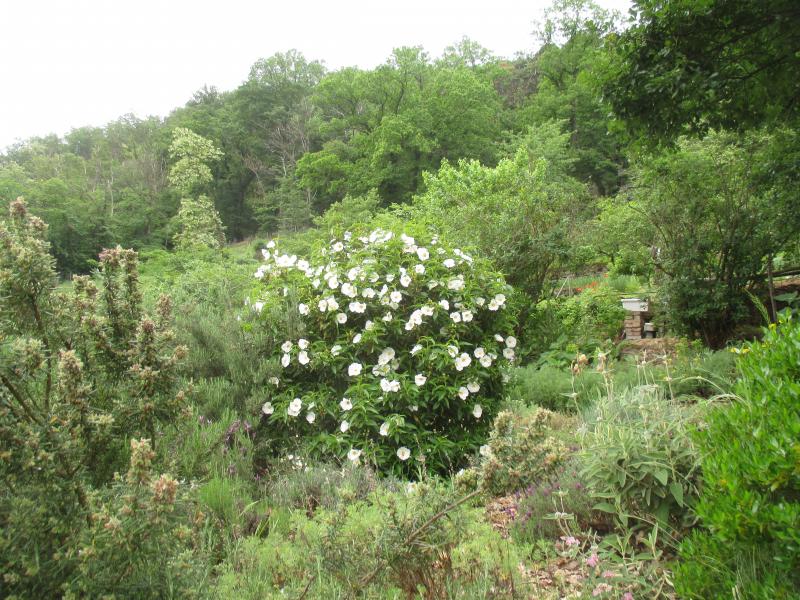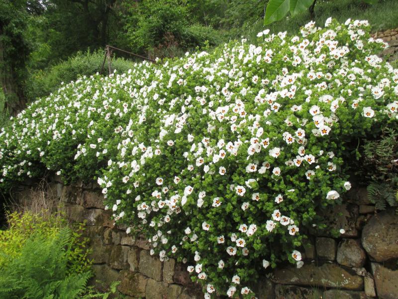 Cistus x laxus 'Snow White' wächst und blüht wie ein Weltmeister. Die Büten sind fast so groß wie Spiegeleier, das Laub kräftig grün. leicht gewellt und die Pflanze steckt Hitze und Trockenheit weg wie nix.