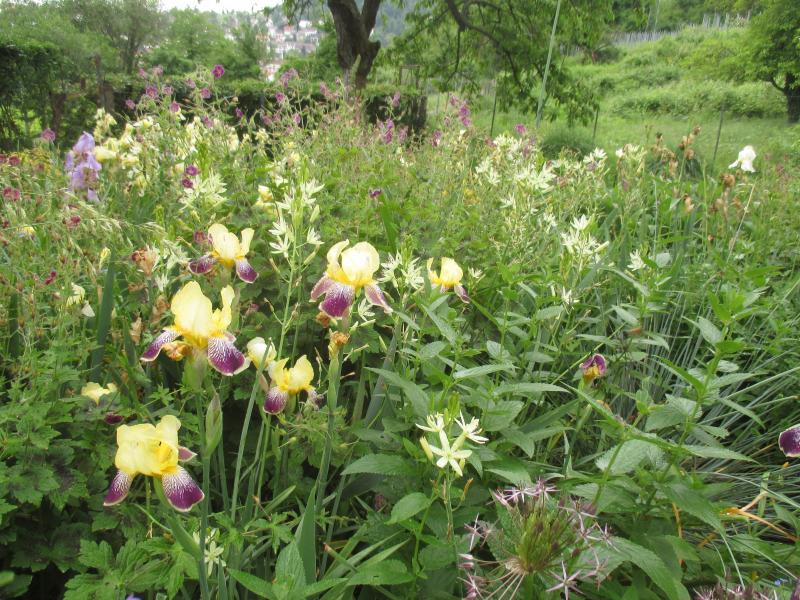 Iris variegata, I. flavescens und I. pallida mit Camassia cusickii, Geranium pheum 'Samobor' und Allium christophii
