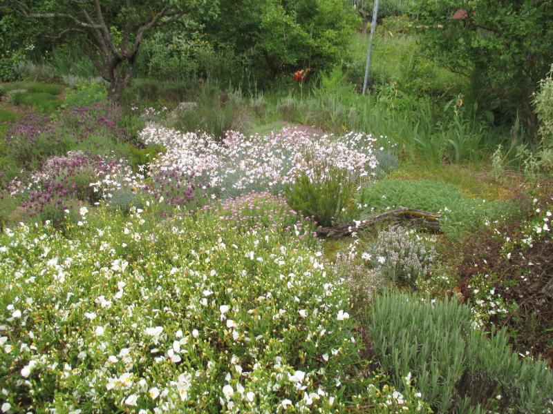 Cistus x laxus 'Snow White' wächst und blüht wie ein Weltmeister. Die Büten sind fast so groß wie Spiegeleier, das Laub kräftig grün. leicht gewellt und die Pflanze steckt Hitze und Trockenheit weg wie nix.