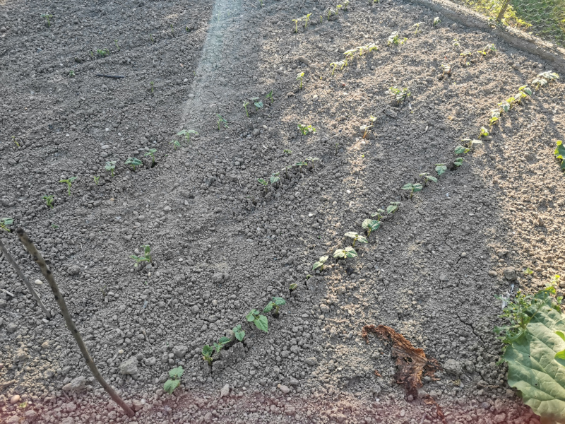 Jedenfalls ists nicht immer homogen, weil ich das Saatbeet eher grob lasse, wegen dem Lufthaushalt, und hier wurde im vorgelockerten, aber gut abgesetzten Boden nur mit dem Daumen das Saatkorn auf die feuchte Schicht unten gedrückt und mit Daumen/Zeigefinger die Reihe wieder zugeschoben, ohne anzudrücken. Also kein Rechen/Harke oder sowas benutzt zum andrücken der Samen.