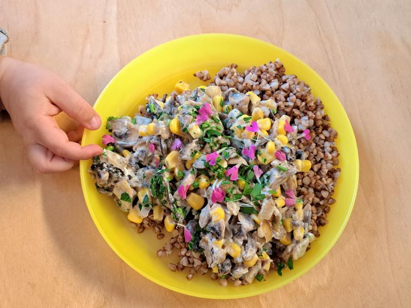 Gestern gab es Spaghetti mit Spargel in Creme-fraiche-Knoblauch-Pecorino-Soße. Heute allerlei Pilze (Champis, Shiitake, Mu-Err) und Mais auf Buchweizen.