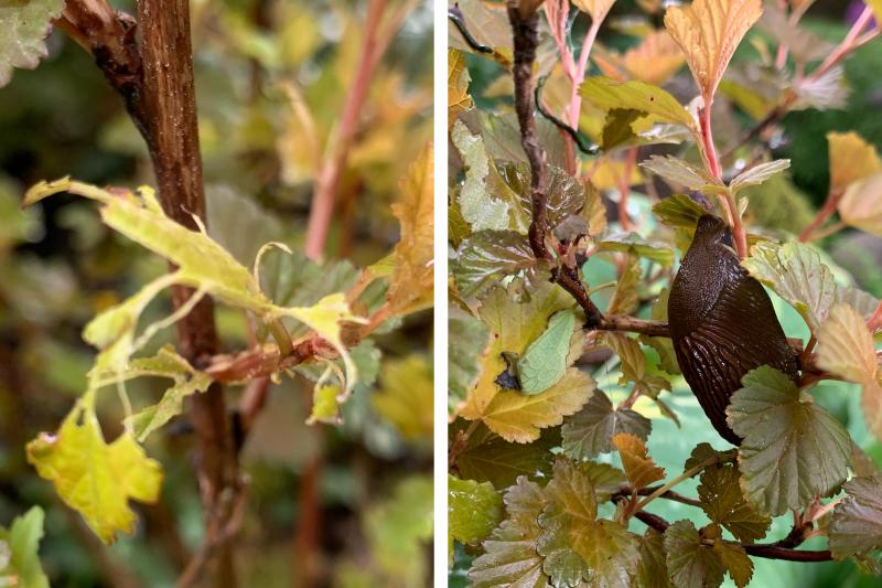 Im Schatten kommt noch ein anderes Problem hinzu: Schnecken lieben die Blasenspieren offenbar sehr! Gestern wunderte ich mich über Kahlfraß an einigen Zweigen und ging auf Suche nach irgendwelchen Raupen als Verursacher… um dann festzustellen, dass drei fette Nacktschnecken im winzigen Strauch hingen >:(