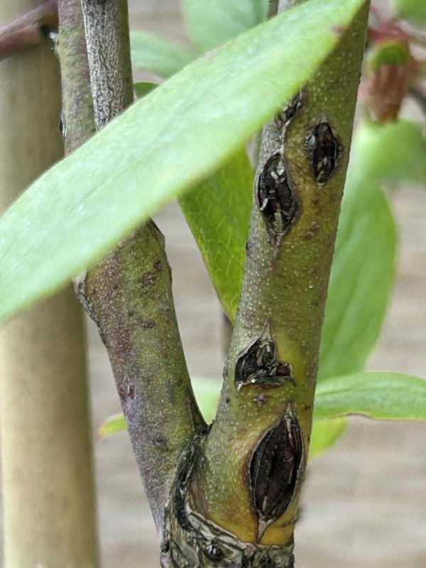 Die Schädigungen sind fast auf allen Trieben, auch den jungen, und ich hab keine Ahnung was das ist. Reklamieren werde ich eh, aber einer Antwort wie „das ist normal/nicht schlimm“ oder „verwächst sich“, komme ich immer gern zuvor mit einer Vermutung was das ist.