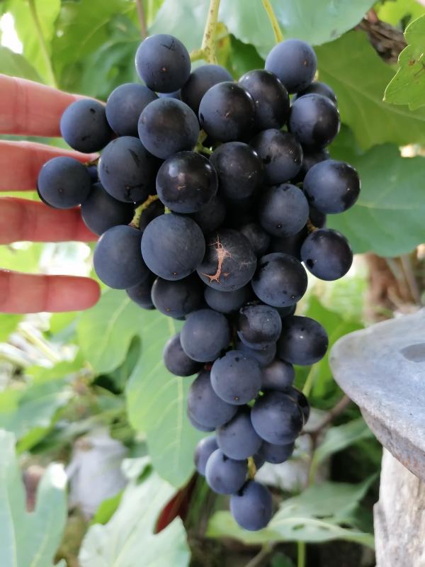 Eben ohne Drähte soll der Wein sich selber halten. Die Jahrestriebe hängen wie ein Vorhang herab und werden 2 Blätter nach der Traube weggeschnitten im Sommer. Das ist eine Einfachversion für mich, die funktioniert. So sehen die Trauben aus