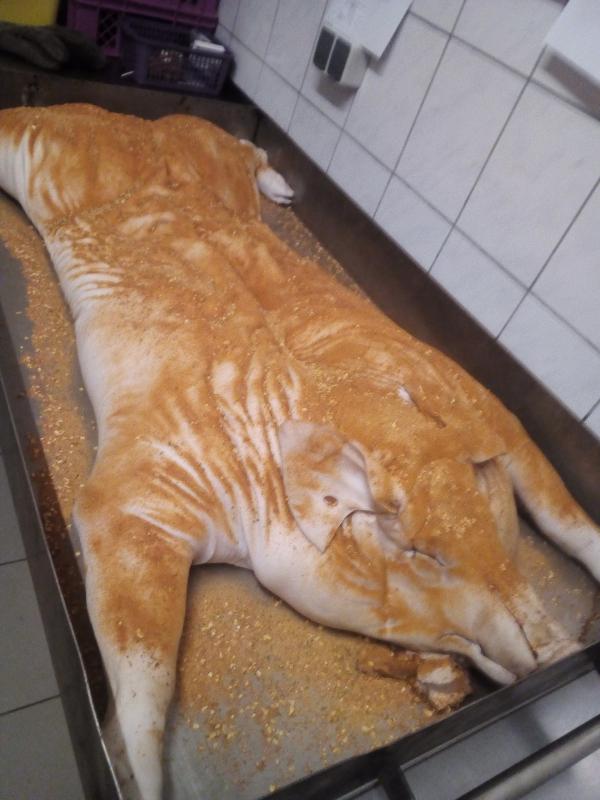 Wir haben gestern (Freitag) ein Schweinchen eingewürzt und in der Bäckerei zur Nachtruhe in die Kühlung gegeben.
