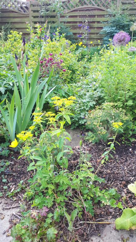 Hier noch einmal das Beet am Zaun mit dem hoch aufragenden Zierlauch, der erstaunlich dauerhaft ist, gepflanzt hatte ich die Zwiebeln im Herbst 2017, viele haben sich gut gehalten oder sogar etwas vermehrt, und natürlich ist vom vergilbenden Laub absolut nichts zu sehen, weil alles so dicht bewachsen ist. Eine einzelne übersehene Goldfelberich-Wurzel hat mittlerweile wieder einen dicken Busch gebildet, da muss ich irgendwann mal 'ran, auch ein Goldruten-Sämling hat schon wieder einen mächtigen Horst gebildet. Den Schachtelhalm versuche ich zu ignorieren, aber wie soll ich in die Beete kommen und dort jäten, wenn alles so dicht bewachsen ist?!