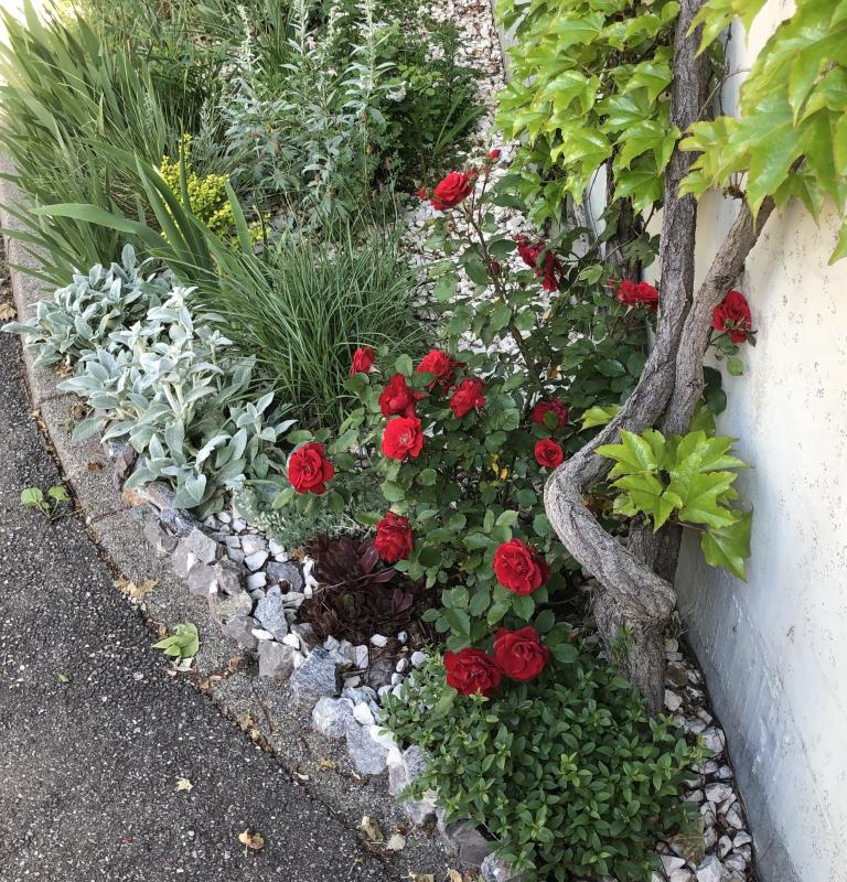 Roter Korsar ist bis jetzt die einzige Rose, die voll aufgeblüht ist. Die steht am Südwand. Sie kann auch klettern, ich werde die doch hochziehen.