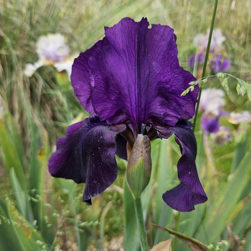 Stipa gigantea blüht vor Vague À L'Âme, diese kleinen gelben Fussel. Die Iris ist auch von der Sorte, die unbedingt überleben will.
