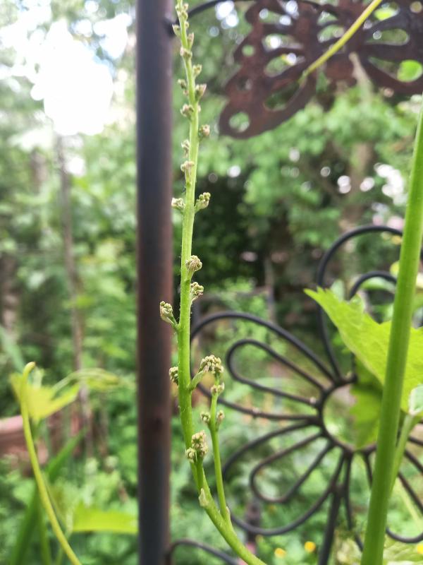 Eine selbstgezogener Klon von Muscat Bleu will dieses Jahr zum ersten mal blühen. Aber irgendwie auch nicht. Alle ca. 10 Gescheine sehen so aus. ;D