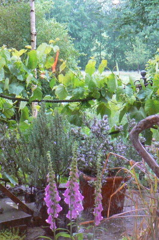 Hier hat sich eine Digitalis in die Pflasterfuge vor der Terrassentür gemogelt, die darf das :). Der kriechende Rosmarin blüht immer noch und im Weinlaub spiegelt sich das Kaminofenfeuer, das man heute gut vertragen kann. Im Hintergrund wallt auch das Gras, naja, wenn es dann mal wieder steht nach dem Regen.