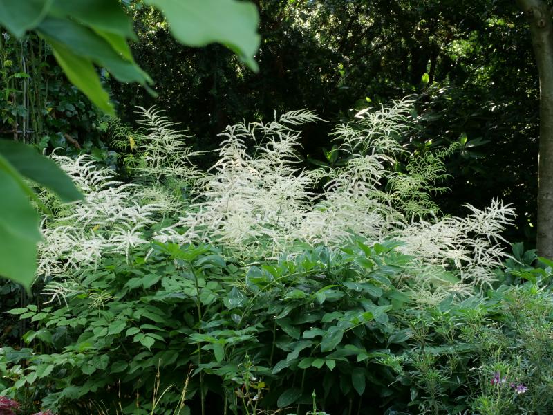 Vor drei oder vier Jahren fand ich ein einsames 11er-Töpfchen mit Aruncus 'Kneiffii' im Gartencenter. Ich nahm es mit, hatte aber nie Platz zum Auspflanzen. Die Pflanze trieb auch im Topf zuverlässig immer zwei Blütenstängel. Letztes Jahr konnte ich sie dann im Beet am Parkplatz auspflanzen, und auch dieses Jahr erfreut sie mich wieder mit den zwei Trieben. Das Laub ist wunderbar zart gefiedert, passend zu den ebenso zarten Blütenständen. :D