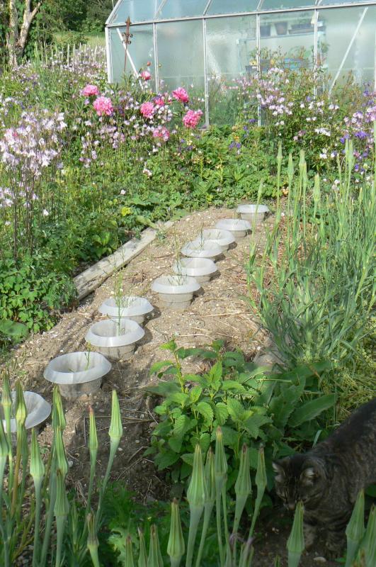 Die Sicherungskopien im Gewächshaus. Ich war vorletztes Wochenende unschlüssig, ob ich Kürbis und co. Auspflanzen soll, bei noch mindestens 2 Wochen Aussichten auf 15-20 Grad und jeder Menge Nässe. Hab es dann gemacht, weil ich dachte, lauter überständige Wurzeldreher bringen auch nichts. Jetzt geht es immer noch mindestens 2 Wochen so weiter und Wetter an der Leine quakt für Sa/So 12 Grad und bis zu 50 l pro Tag.
