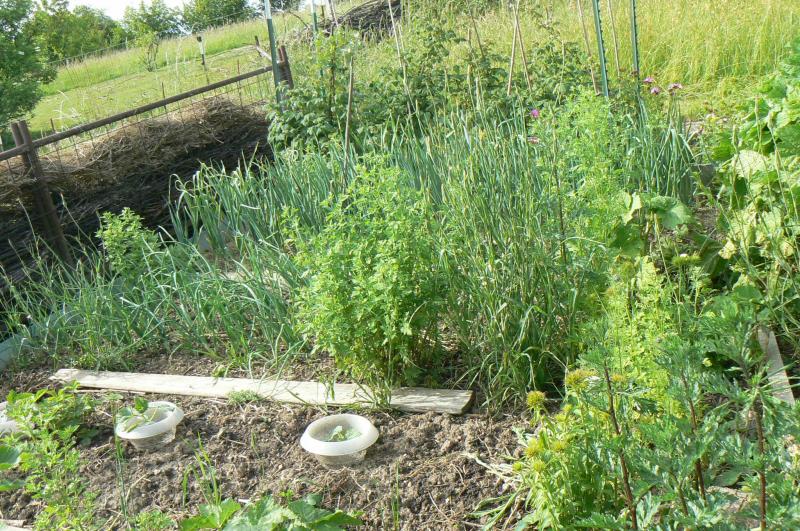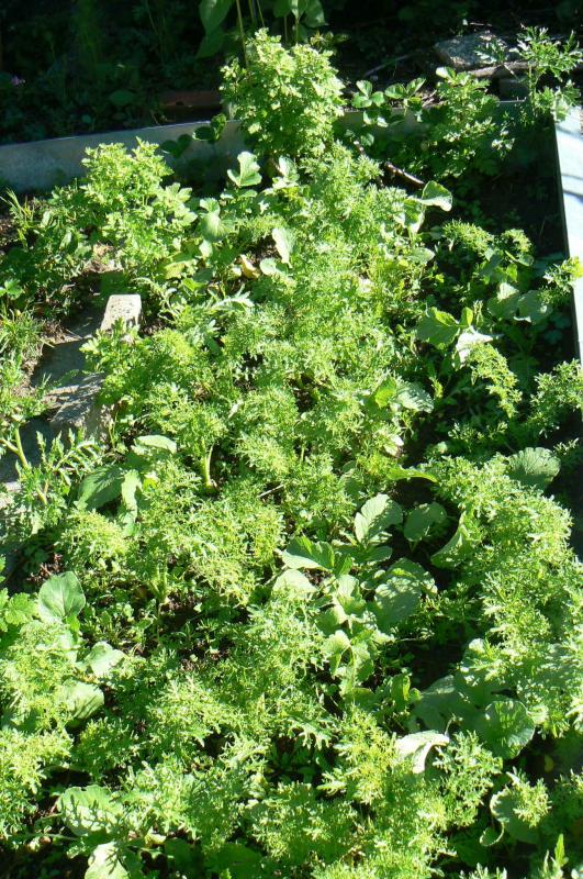 Auch wenn es nicht so aussieht, das ist das Möhrenbeet. Nachdem ich letztes Jahr vom ganzen Beet etwa ein halbes Dutzend Möhren geerntet habe, habe ich dieses Jahr jede Menge Opferpflanzen für die Schnecken gesät (Radieschen, Rettich, Asia-Salat). Es kommt mindestens ein halbes Dutzend Möhren pro Reihe, vielleicht sogar mehr.