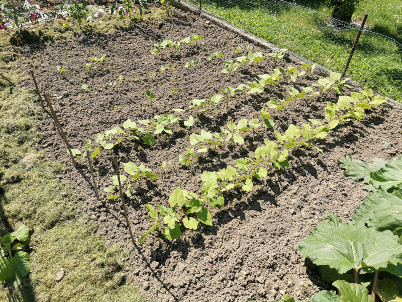 Nun gut, für die Reihenfetischisten, hier die Buschbohnen. Alles was nicht in der Reihe wächst überlebt die Hacke nicht.
