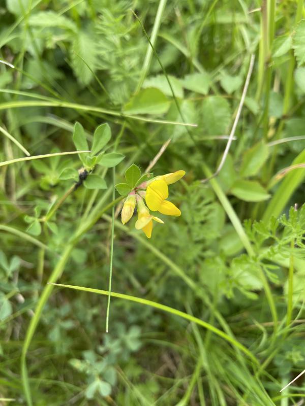 der Hornklee ist der, der in der Wiese mit den Rundblättrigen Glockenblumen wächst.