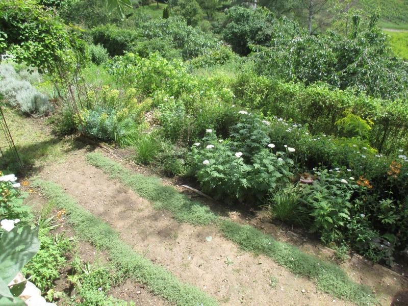 Bei der Terasse mit mediterranen Gehölzen musste ich den Weg nur mähen. Nicht fragen was ich alles aus den Beeten frimmelte - und - was wohl die wenigsten ahnen: Auch Trockenmauern müssen gejätet werden. Ja, ja besonders wenn es permanent regnet, weil der Wind statt wie gewohnt aus Westen aus Südosten kommt.
